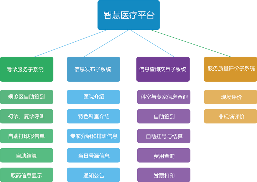 信息查詢交互子(zǐ)系統可(kě)以實現(xiàn)科(kē)室與專家(jiā)信息查詢、自(zì)助簽到(dào)、自(zì)助挂号、結算(suàn)、費(fèi)用×(yòng)查詢、發票(piào)打印、自(zì)助取報(bào)告單等功能(néng)。